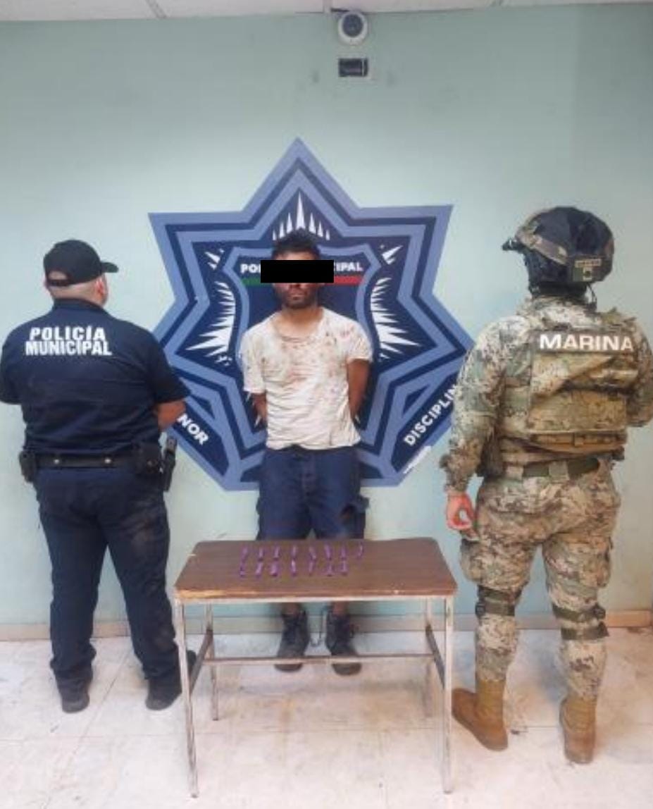 Debido a lo anterior, oficiales utilizaron la fuerza física aplicando técnicas de control para llevar a cabo la detención y colocarle candados metálicos, para después realizarle una revisión corporal, detectándole en su vestimenta un total de 15 envoltorios de cristal.