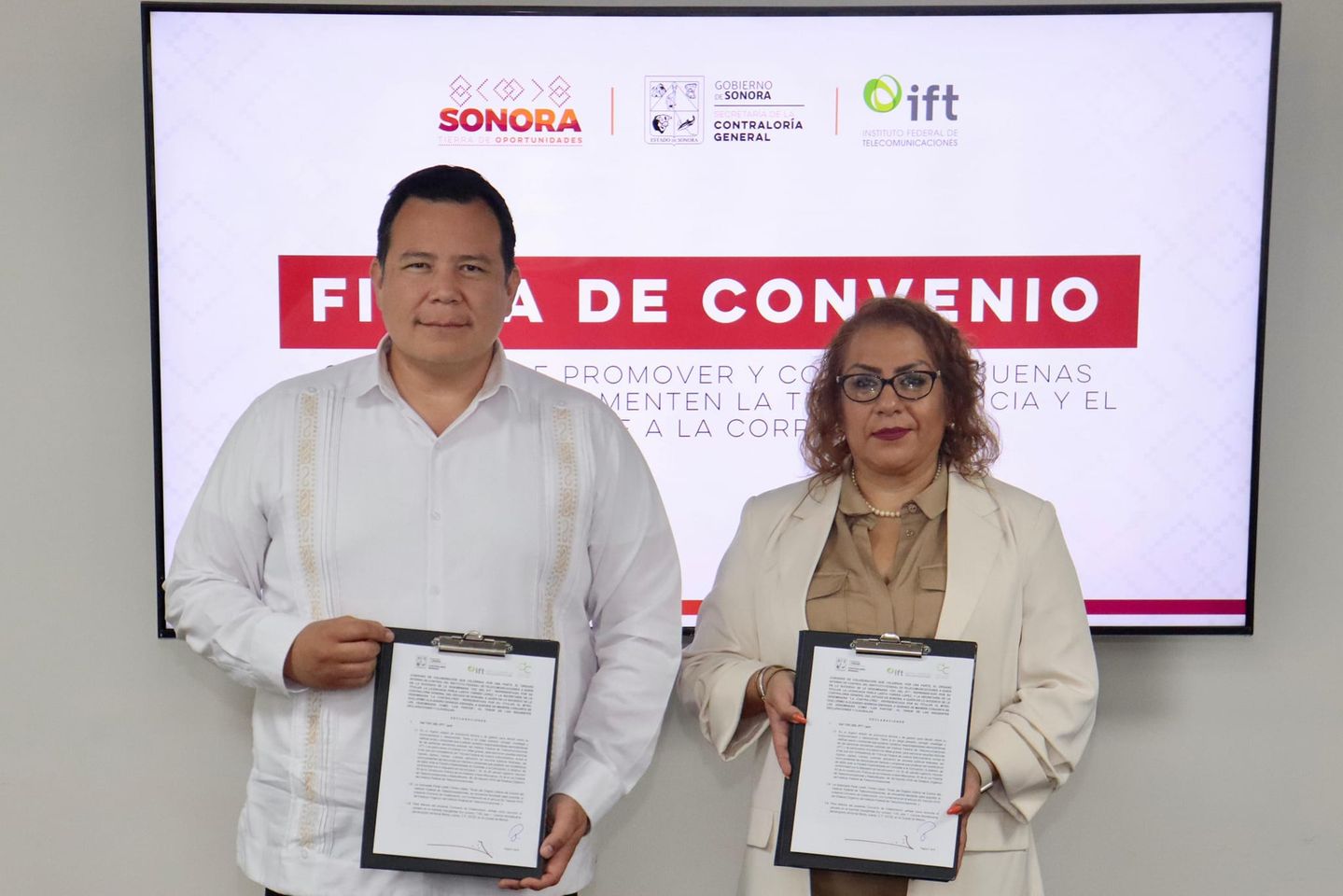 Hermosillo.- Con el objetivo concreto de promover y compartir buenas prácticas que fomenten la transparencia y el combate a la corrupción, la Secretaría de la Contraloría General del Estado de Sonora firmó un convenio de colaboración con el Órgano Interno de Control (OIC) del Instituto Federal de Telecomunicaciones (IFT).