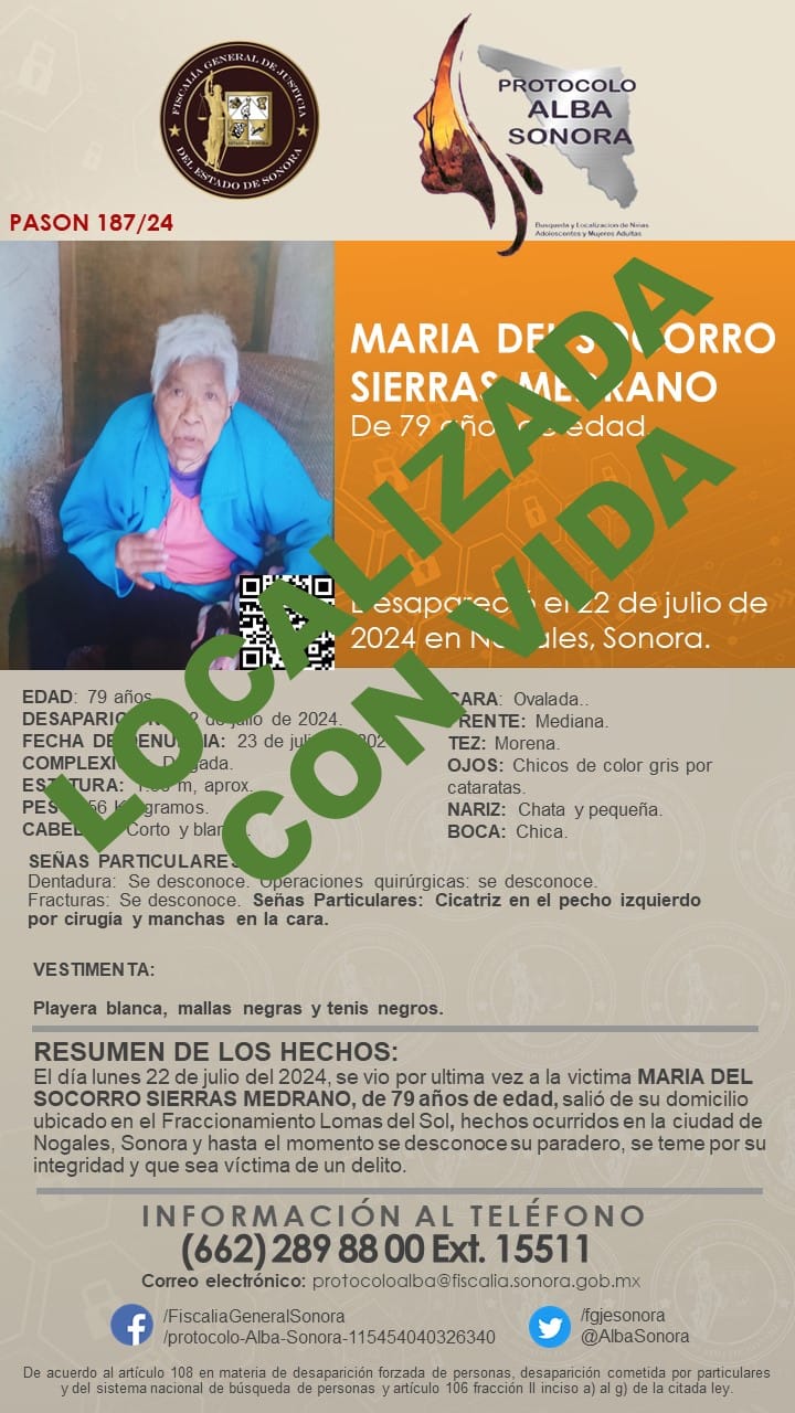 Se agradece su valiosa colaboración en difusión de la presente cédula a nombre de MARÍA DEL SOCORRO SIERRAS MEDRANO, de 79 años de edad; afortunadamente localizada con vida
