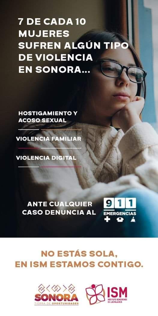 ¡No estás sola, en el Instituto Sonorense de las Mujeres te podemos ayudar! El #ISM está contigo! #DESPIERTASONORA Navegación de entradas VINCULADO A PROCESO Y EN PRISIÓN PREVENTIVA POR LESIONES ALERTA POR LLUVIA CIERRAN CARRETERA