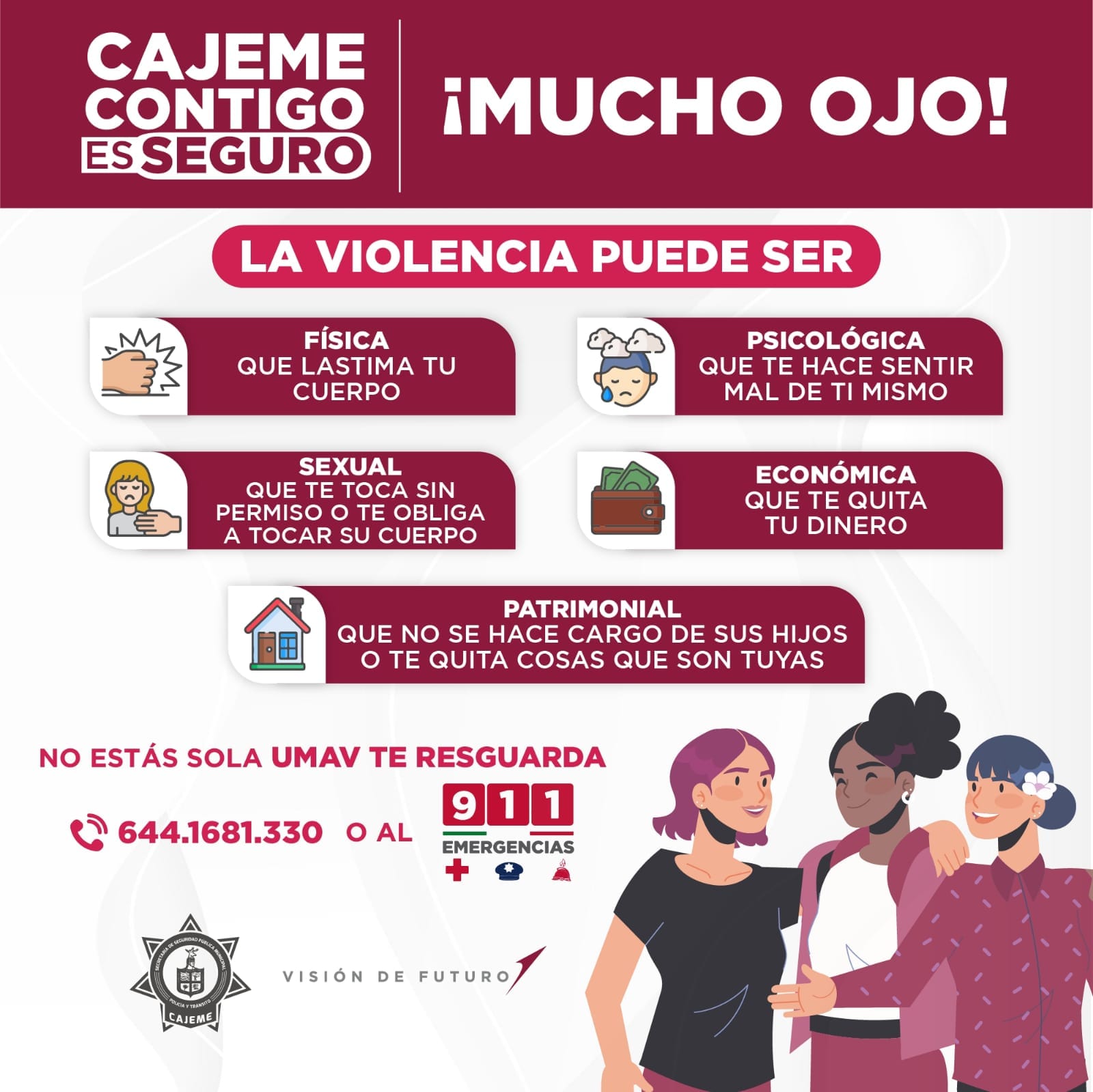 +UMAV está contigo, si sufres algún tipo de violencia contáctanos directamente a nuestro número de cuadrante 6441681330 o vía WhatsApp al C2 de la SSPM al 6441386243