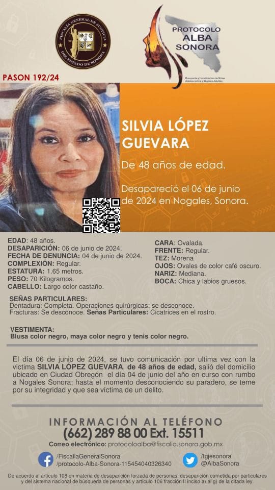 Se solicita a la ciudadanía su colaboración en la difusión de la cédula de Protocolo Alba para la búsqueda y pronta localización de SILVIA LÓPEZ GUEVARA de 48 años de edad. Desapareció el 06 de junio de 2024, en Nogales, Sonora.