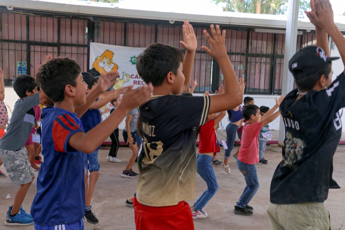 Durante el campamento se realizan actividades físicas con las y los menores, a quienes también se les informa sobre los números de emergencias 911 y la denuncia anónima al 089.