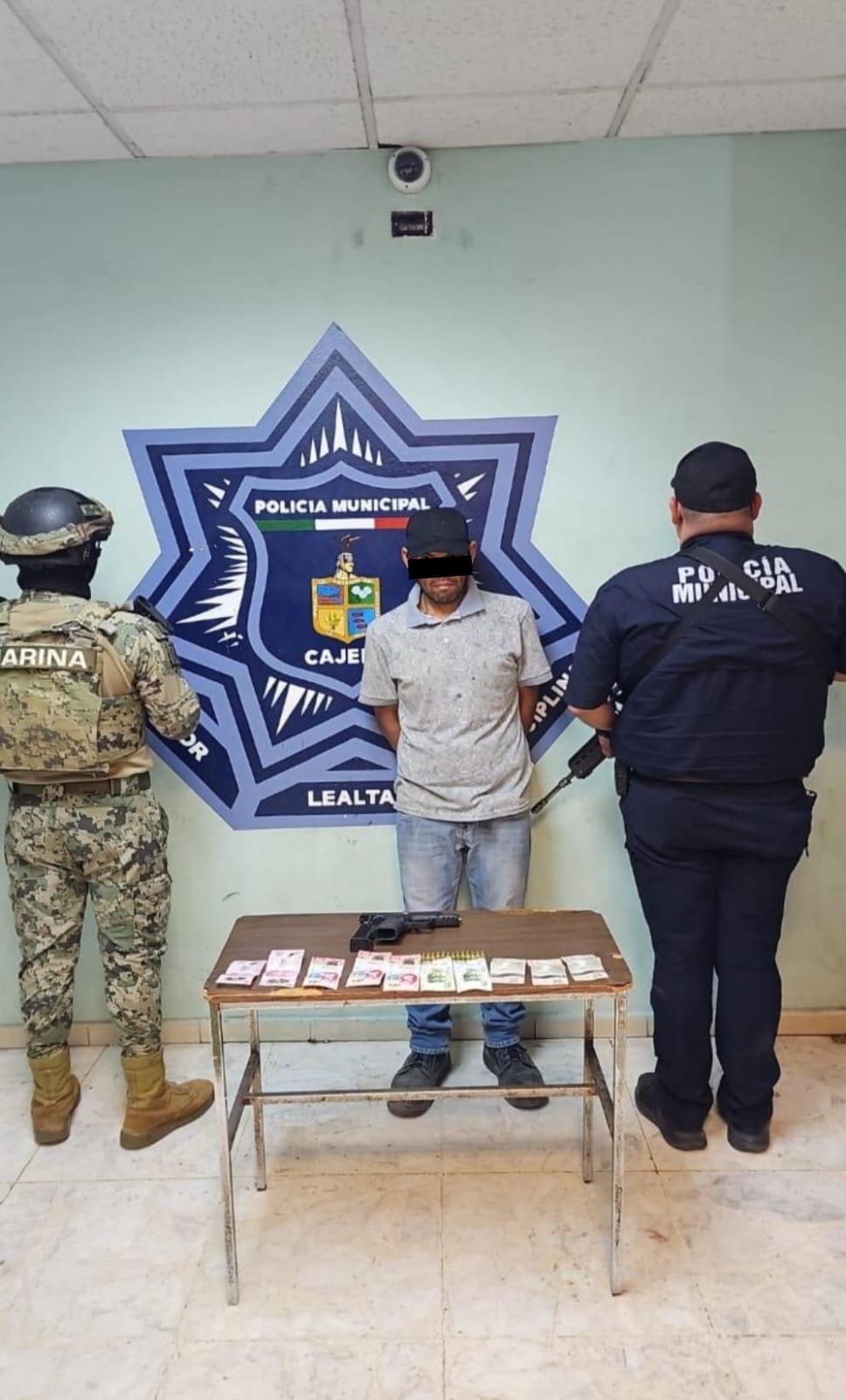 Al efectuar un operativo nocturno en el polígono de Villa Bonita, oficiales de la Secretaría de Seguridad Pública Municipal y Marina, realizaron la captura de un hombre por la probable comisión del delito de robo con violencia en contra del sector comercio, asegurando un arma de fuego corta y la cantidad del botín sustraído.
