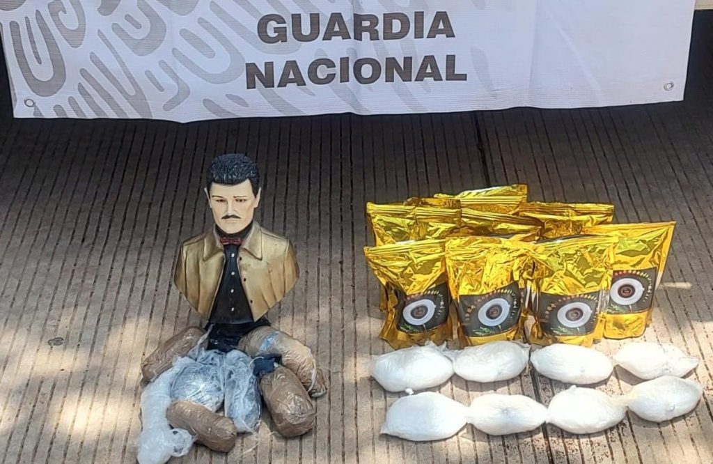 Los guardias nacionales inspeccionaron la caja y localizaron varias veladoras junto a una figura de fibra de vidrio, la cual ocultaba en su interior siete envoltorios con una sustancia blanca y cristalina. Asimismo, había paquetes que indicaban contener café de grano; sin embargo, en cada uno encontraron bolsas más pequeñas con posible droga sintética cristal.