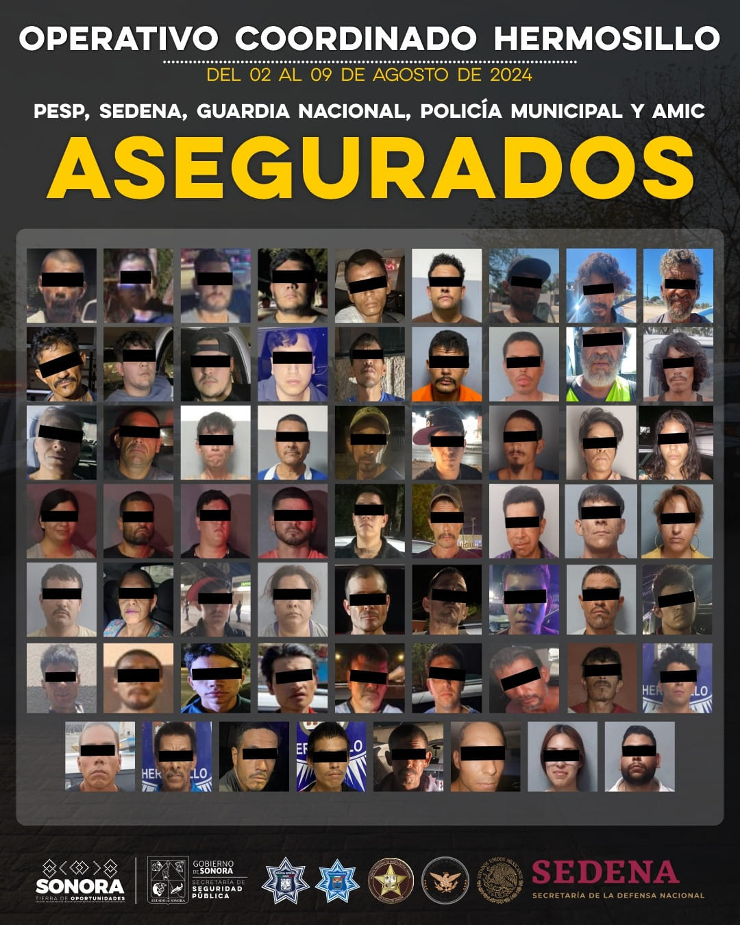 Hermosillo.- Elementos que participan en el operativo coordinado de los tres niveles de gobierno, en Hermosillo, realizaron la detención de 83 personas durante las acciones que se implementaron para disminuir la incidencia delictiva en la ciudad.