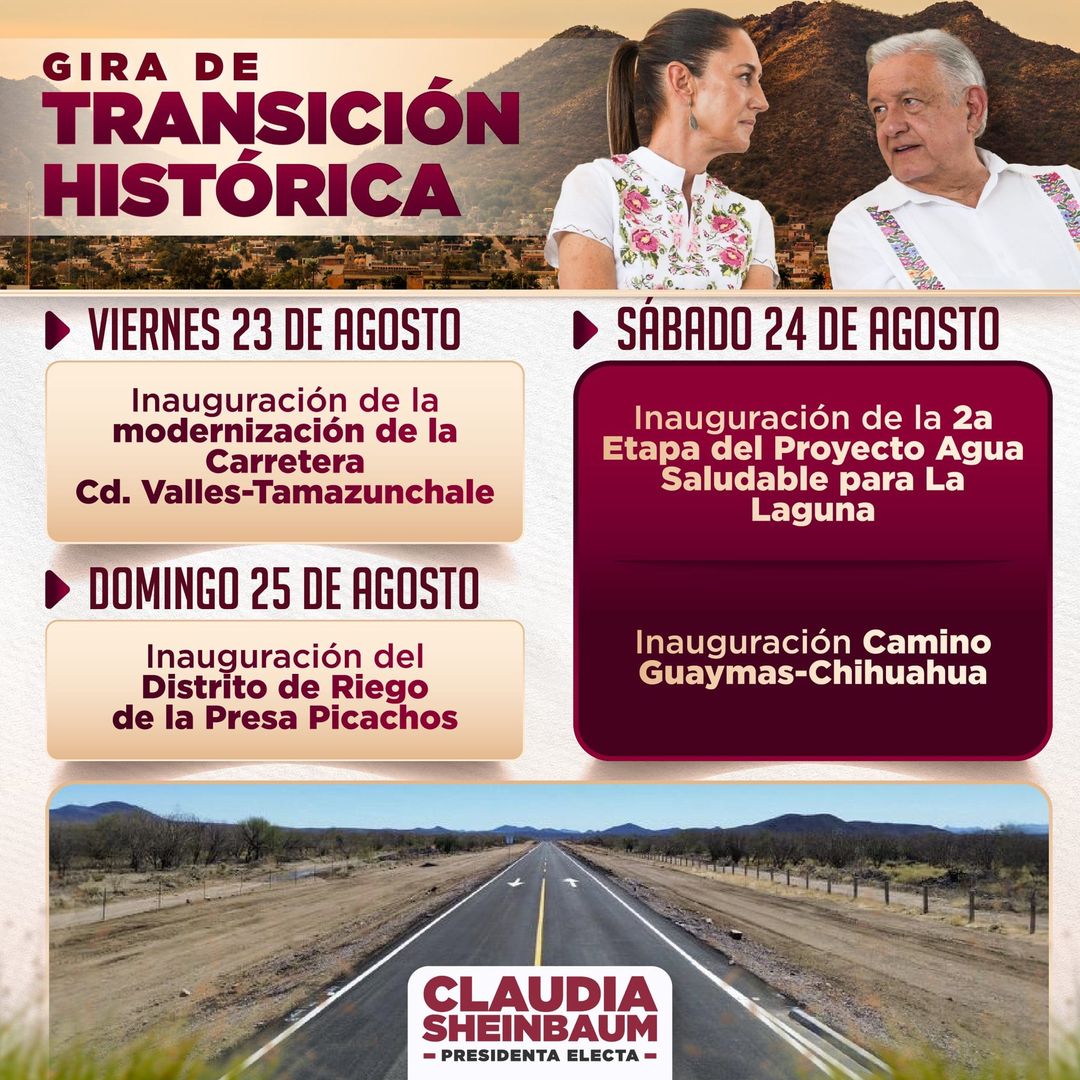 LA PRESIDENTA ELECTA, CLAUDIA SHEINBAUM, PUBLICÓ EN SUS REDES SOCIALES LA AGENDA QUE TENDRÁ ESTE FIN DE SEMANA Y CONFIRMA QUE MAÑANA SÁBADO ESTARÁ EN GUAYMAS, SONORA, JUNTO AL PRESIDENTE LÓPEZ OBRADOR Y EL GOBERNADOR ALFONSO DURAZO