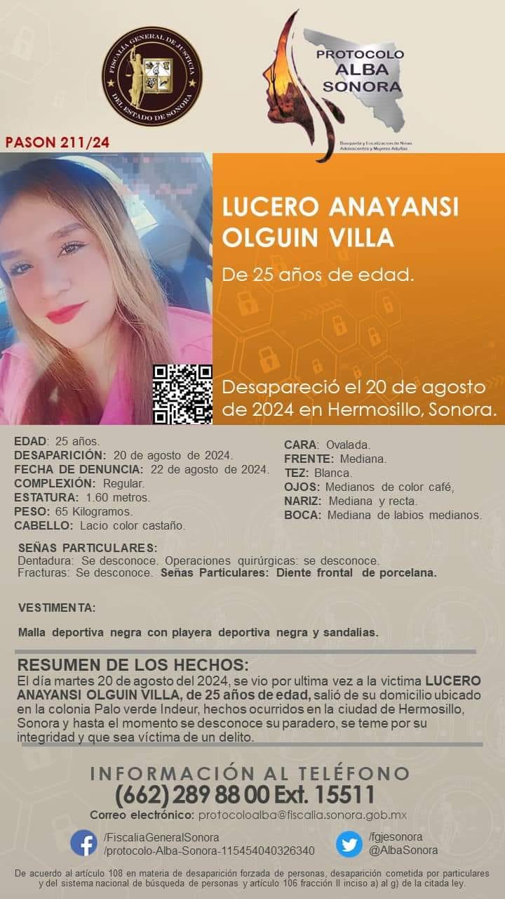 Se solicita a la ciudadanía su colaboración en la difusión de la cédula de Protocolo Alba para la búsqueda y pronta localización de LUCERO ANAYANSI OLGUÍN VILLA, de 25 años de edad. Desapareció el 20 de agosto de 2024, en Hermosillo, Sonora