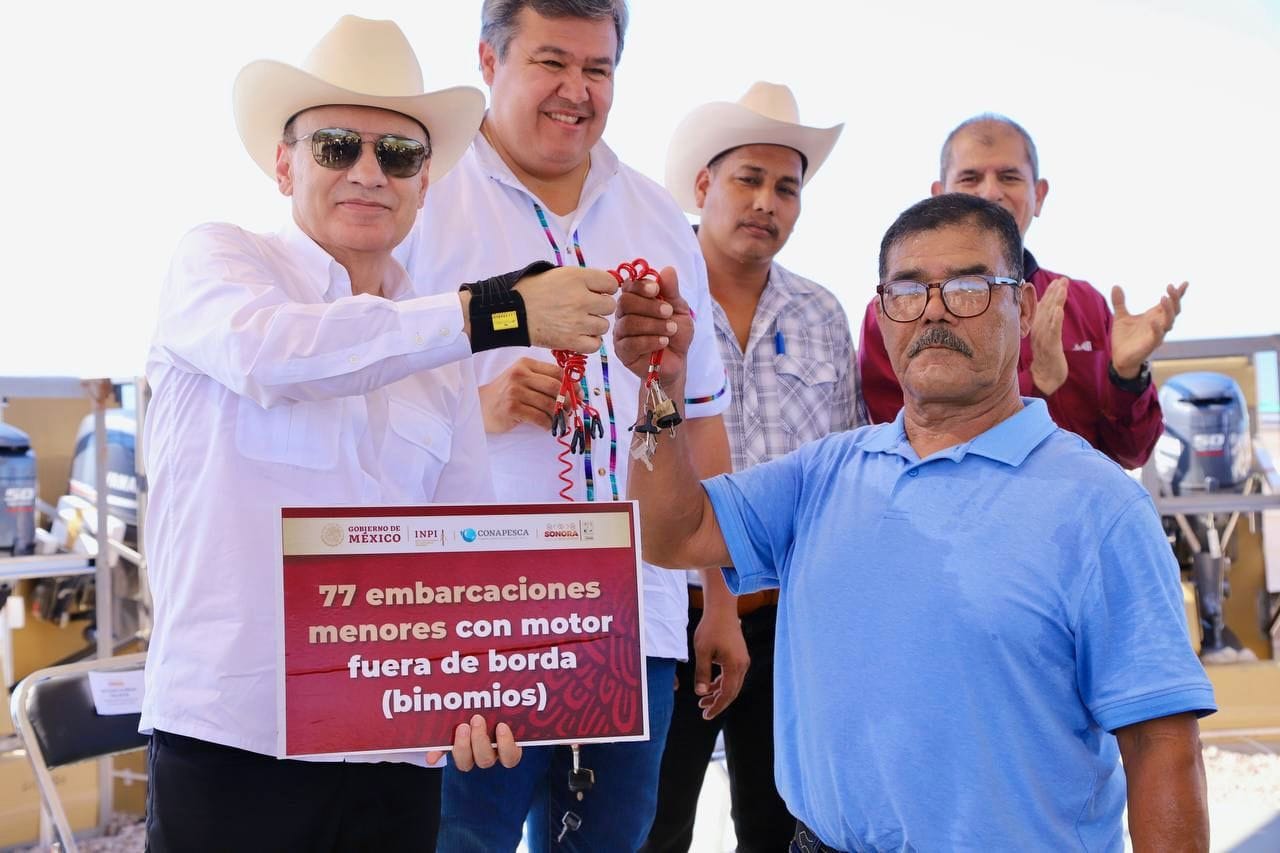 Las Guásimas.- En cumplimiento al Proyecto Estratégico para el Desarrollo Pesquero para Justicia del Pueblo Yaqui, el gobernador Alfonso Durazo Montaño y el Comisionado Nacional de Acuacultura y Pesca (Conapesca), Octavio Almada Palafox, entregaron 77 embarcaciones y 77 motores fuera de borda, que en su conjunto forman un binomio, a pescadores de Las Guásimas con lo que suman 303 equipos con una inversión de 106.8 millones de pesos.