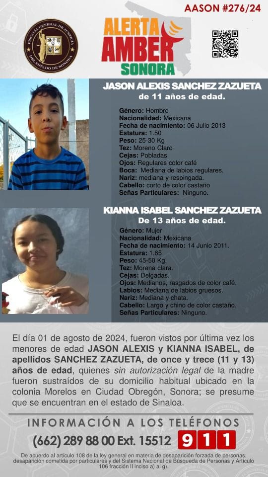SE ACTIVA ALERTA AMBER SONORA PARA BÚSQUEDA y LOCALIZACIÓN DE LOS HERMANOS JASON ALEXIS SÁNCHEZ ZAZUETA y KIANNA ISABEL SANCHEZ ZAZUETA, de 11 y 15 años de edad respectivamente, sustraídos el 01 de agosto de 2024 en Obregón, Sonora.