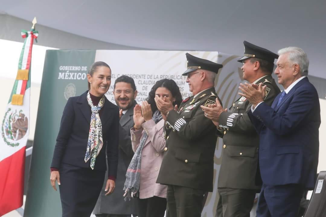 La Presidenta electa asistió al evento en el Colegio Militar junto a Andrés Manuel López Obrador y la planilla mayor de Sedena y Semar. El presidente en funciones y la próxima mandataria estuvieron flanqueados por los secretarios salientes de Defensa Nacional, Luis Crescencio Sandoval, de Marina Rafael Ojeda y los próximos titulares de las dependencias Ricardo Trevilla y Raymundo Pedro Morales.