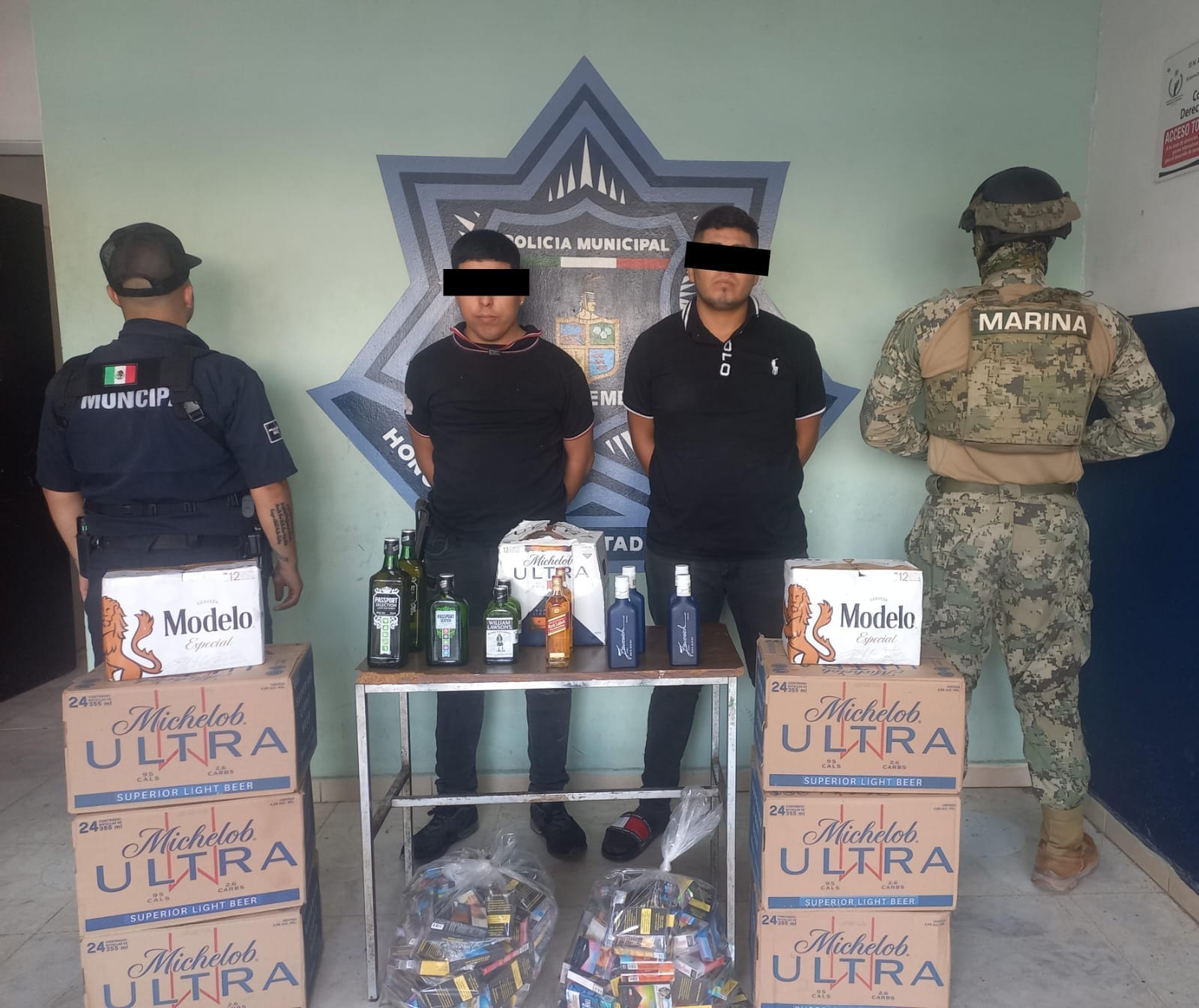 Procediendo alrededor de las 04:23 horas, por la calle Flavio Bórquez y Tabasco de mencionado asentamiento urbano, con la captura de José Armando “N.”, de 25 años y Bryan Eli “N.”, de 20 años, por el probable delito de robo con violencia en contra del sector comercio.