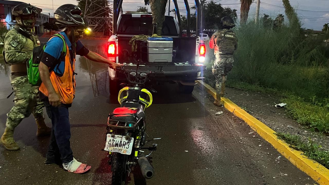 Elementos de la Policía Municipal de Cajeme auxiliaron a un ciudadano de nombre Guadalupe, cuando al circular a la altura de la Plaza 300 a bordo de una motocicleta esta sufrió un desperfecto en los momentos en que caía un aguacero.
