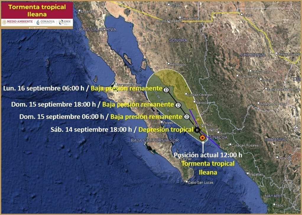 Al momento la tormenta tropical Ileana frente a las costa norte de Sinaloa, mantiene la probabilidad de lluvias puntuales torrenciales en el sur de Sonora y el norte de Sinaloa, y lluvias muy fuertes en Baja California Sur, Chihuahua y Durango.