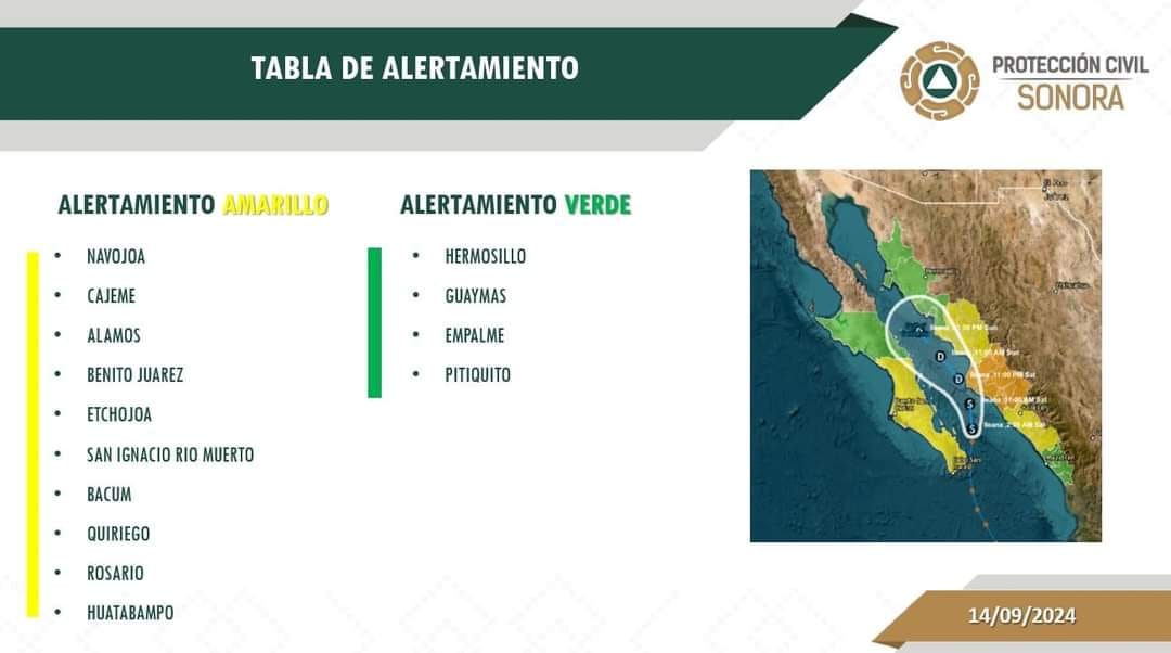 Simultáneamente, se prevén vientos con rachas de 50 a 70 km/h y oleaje de 1 a 3 metros de altura en el sur del golfo de California (costa oriental de Baja California Sur, costa norte de Sinaloa y costa sur de Sonora).