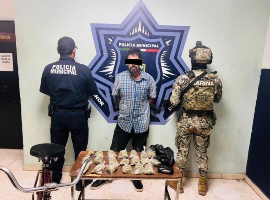 Realizando una inspección física encontrándole en una bolsa de color negro que portaba 20 envoltorios, mismos que contenían en su interior una hierba verde y seca similar a la marihuana, procediendo con la aprehensión del presunto conforme al protocolo de detenciones.