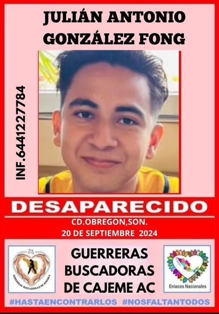 Se solicita a la ciudadanía su colaboración en la búsqueda y pronta localización de JULIÁN ANTONIO GONZÁLEZ FONG 19 años de edad. Desapareció el 20 de septiembre de 2024, en Obregón, Sonora.