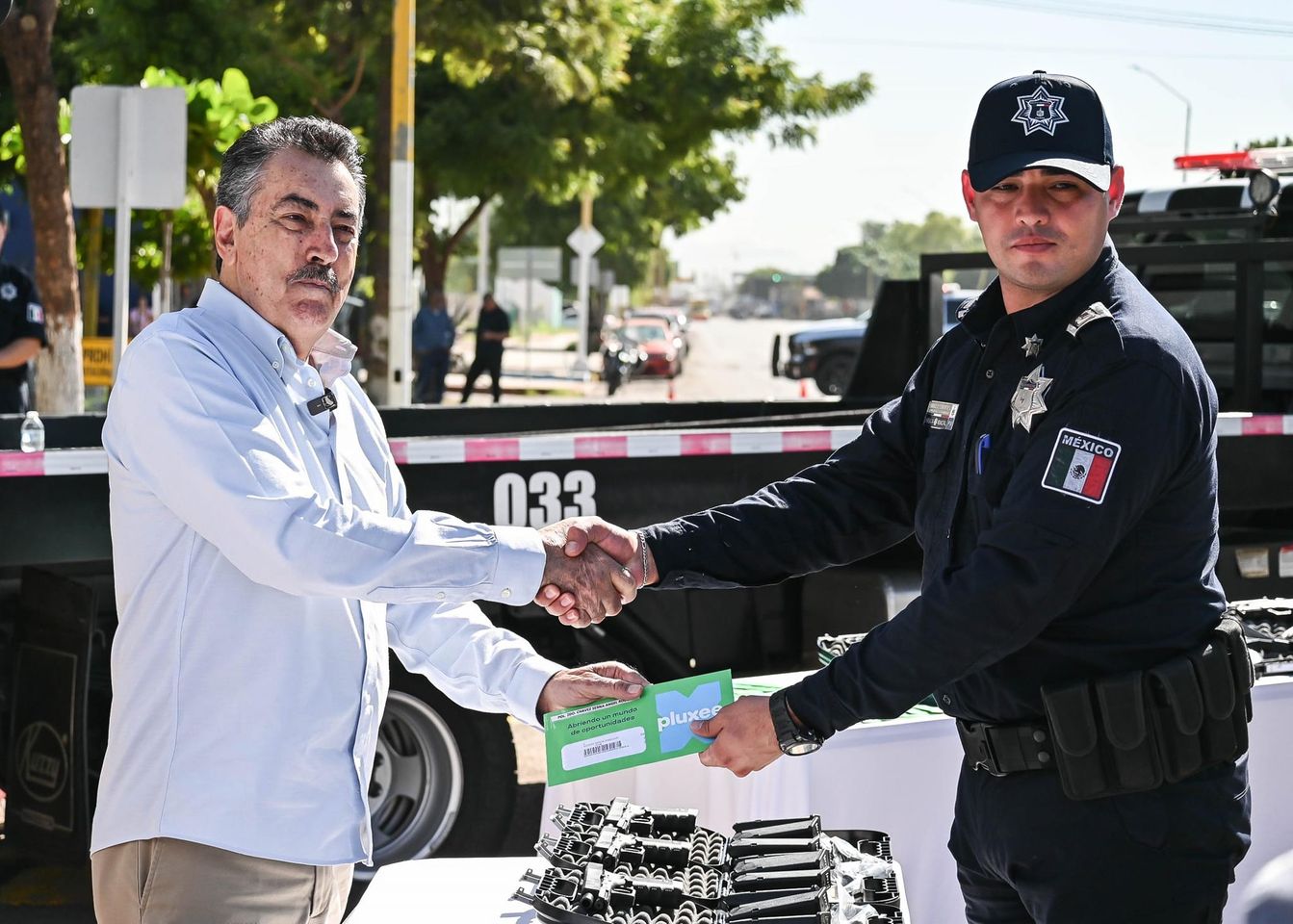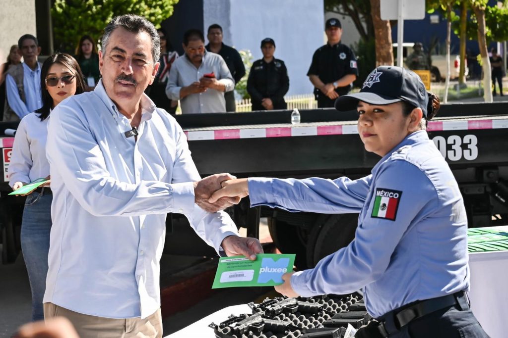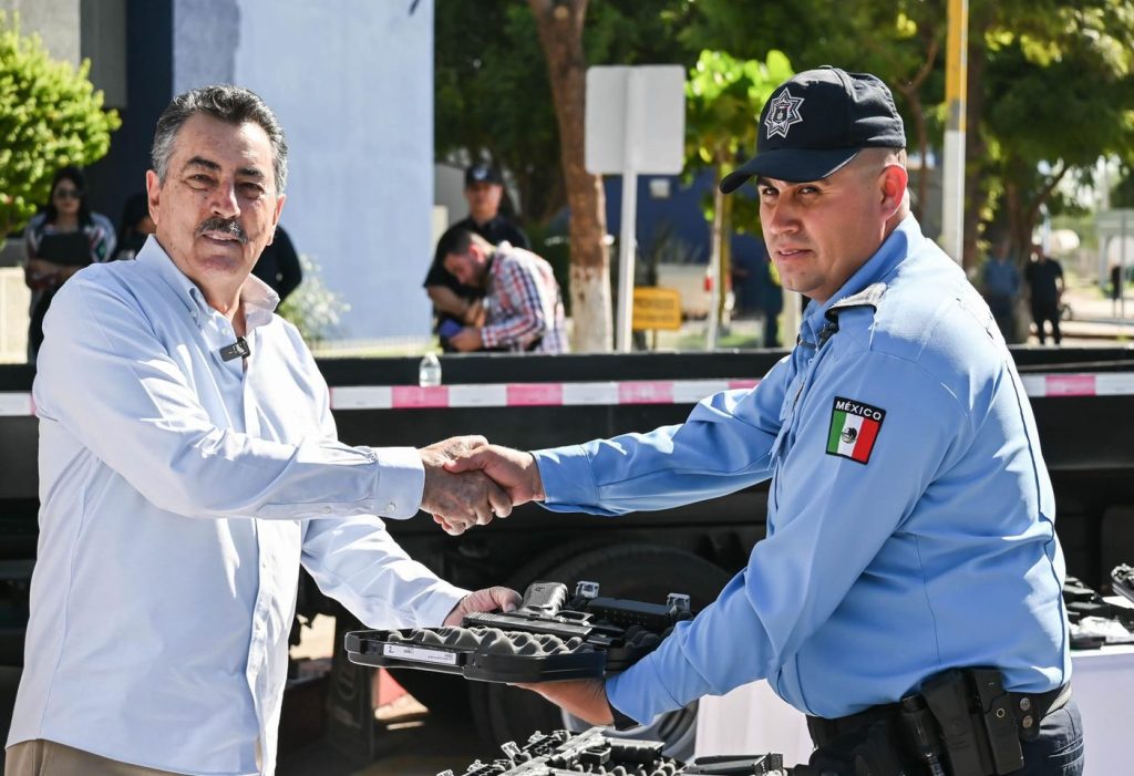 Para eficientar el servicio que brindan las y los agentes de la Secretaría de Seguridad Pública Municipal, además de estimular su labor, el Presidente Municipal Javier Lamarque, llevó a cabo la entrega de dos grúas, 19 armas de fuego cortas, 297 cargadores y 700 vales de despensa para la corporación policial de Cajeme.
