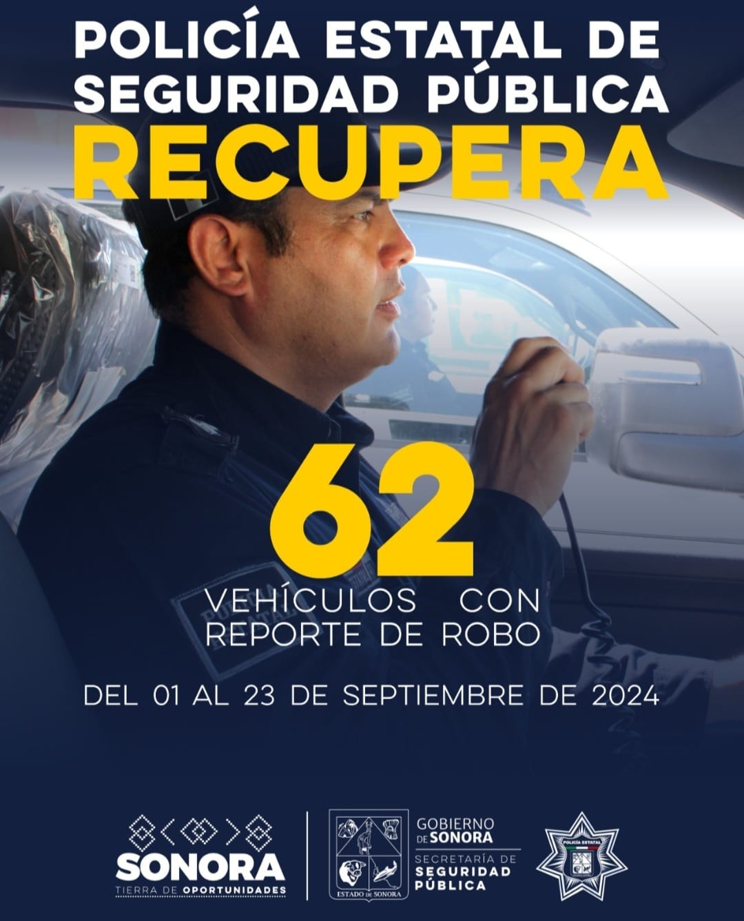 Del 1 al 23 de septiembre la corporación fortaleció la intervención en los operativos por municipios de Sonora, generando la recuperación de los 62 autos a través de la colaboración con personal capacitado en sistemas de tecnología que permiten identificar los datos de estos vehículos.