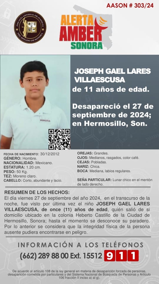 SE ACTIVA ALERTA AMBER SONORA PARA BÚSQUEDA y LOCALIZACIÓN DE JOSEPH GAEL LARES VILLAESCUSA, de 11 años de edad, desapareció el 27 de septiembre de 2024 en Hermosillo, Sonora.