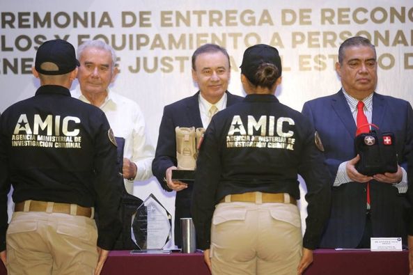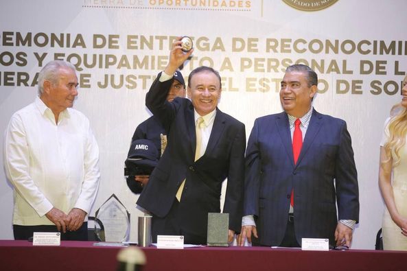 Hermosillo.- Con el fin de contribuir al desarrollo y profesionalización de las corporaciones de seguridad encargadas de salvaguardar la integridad de las familias sonorenses, preservar el orden y la paz social, el gobernador Alfonso Durazo Montaño encabezó la ceremonia de entrega de reconocimientos, estímulos y equipamiento a personal de la Fiscalía General de Justicia del Estado de Sonora.