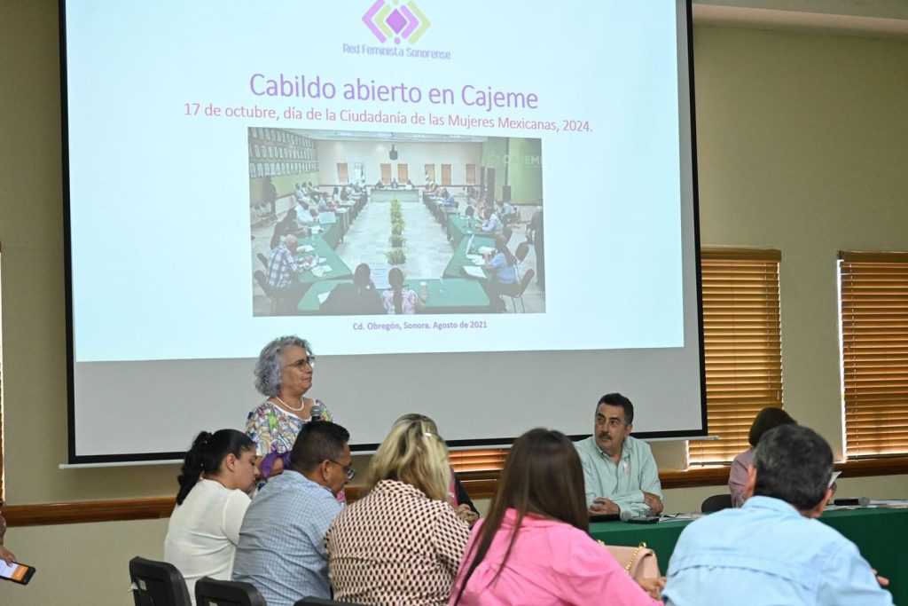 CAJEME. – Al celebrar la Sesión Abierta y Pública del Ayuntamiento, las y los integrantes del cuerpo colegiado aprobaron las propuestas ciudadanas orientadas a la dignificación y el efectivo cumplimiento con los derechos de las mujeres, mediante el apego a los principios de igualdad y paridad de género, así como la garantía de una vida libre de violencia, entre otras, expuestas por las representantes de las Asociaciones Alternativa Cultural por la Equidad de Género y Red Feminista Sonorense, representadas por Guadalupe Hernández López y Leticia Burgos Ochoa, de manera respectiva.