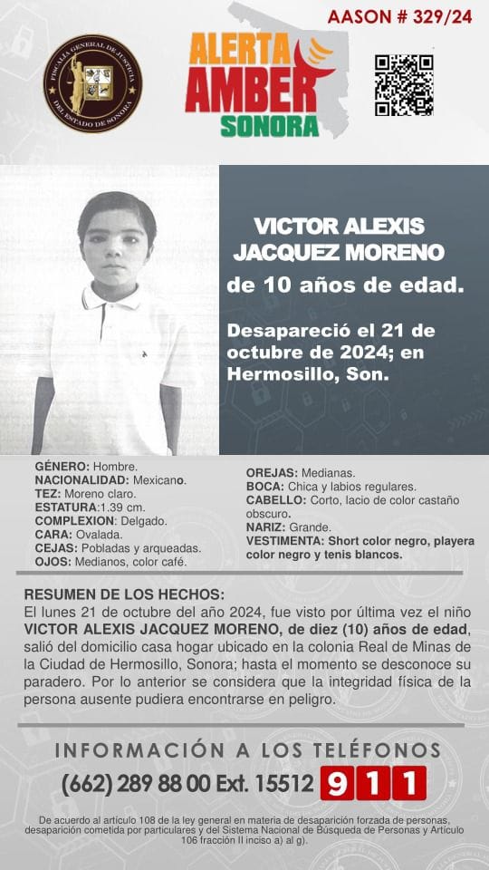 SE ACTIVA ALERTA AMBER SONORA PARA BÚSQUEDA y LOCALIZACIÓN DE VÍCTOR ALEXIS JACQUEZ MORENO, de 10 años de edad, desapareció el 21 de octubre de 2024 en Hermosillo, Sonora