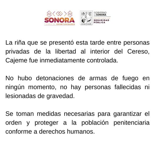 #DESPIERTASONORA La rápida intervención de las autoridades controló la riña entre reos en el Cereso de Cd. Obregón Navegación de entradas Tragedia!! impacta vehículo contra una vaca Promueve Gobernador Durazo la cultura y literatura sonorense en la 24 edición de FELISON