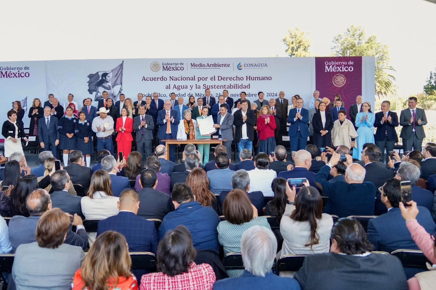 Ciudad de México; 25 de noviembre de 2024.- Con la firma del Acuerdo Nacional por el Derecho Humano al Agua y la Sustentabilidad promovido por la presidenta Claudia Sheinbaum Pardo y asumido por gobernadores emanados de todos los partidos, empresarios, instituciones académicas y distritos de riego, se establecen acciones concretas para garantizar el suministro del vital líquido en beneficio de las y los sonorenses, aseveró el gobernador Alfonso Durazo Montaño.