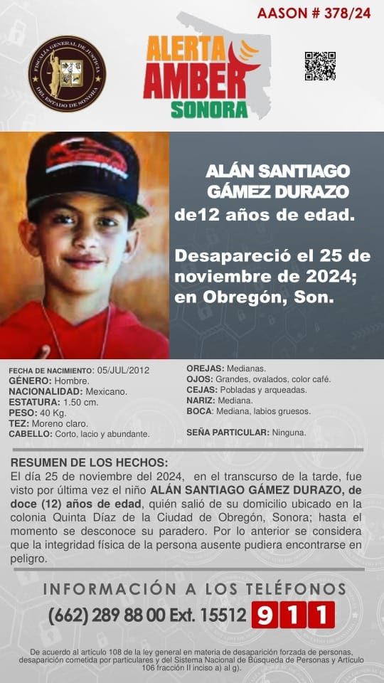 ALÁN SANTIAGO GÁMEZ DURAZO, de 12 años de edad, desapareció el 25 de noviembre de 2024 en Ciudad Obregón, Sonora.![]()