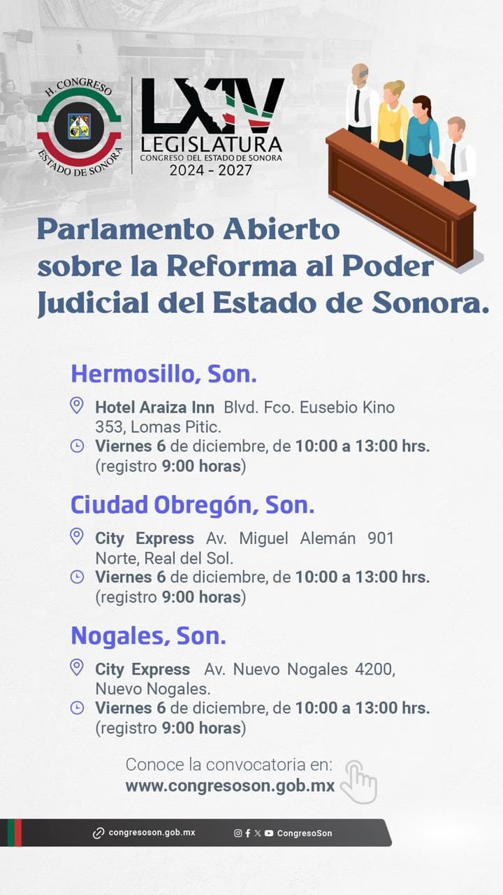 Hermosillo, Sonora; 5 de diciembre de 2024. – Con el propósito de fomentar la participación ciudadana en torno a la reforma constitucional al Poder Judicial local, propuesta por el Ejecutivo estatal, el Congreso de Sonora reiteró su invitación a las y los interesados a sumarse a los ejercicios de Parlamento Abierto que se llevarán a cabo este viernes 6 de diciembre en Hermosillo, Nogales y Cajeme.