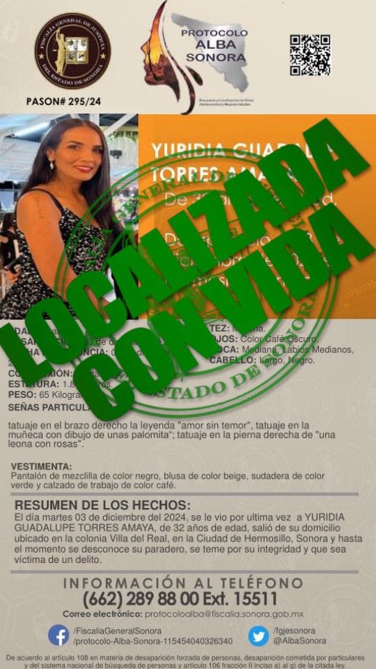 Se agradece su valiosa colaboración en difusión de la presente cédula a nombre de *YURIDIA GUADALUPE TORRES AMAYA, de 32 años de edad*; localizada sana y salva. Salió por cuenta propia de su domicilio, manifestó encontrarse bien y en buen estado de salud y no haber sido víctima de ningún delito.