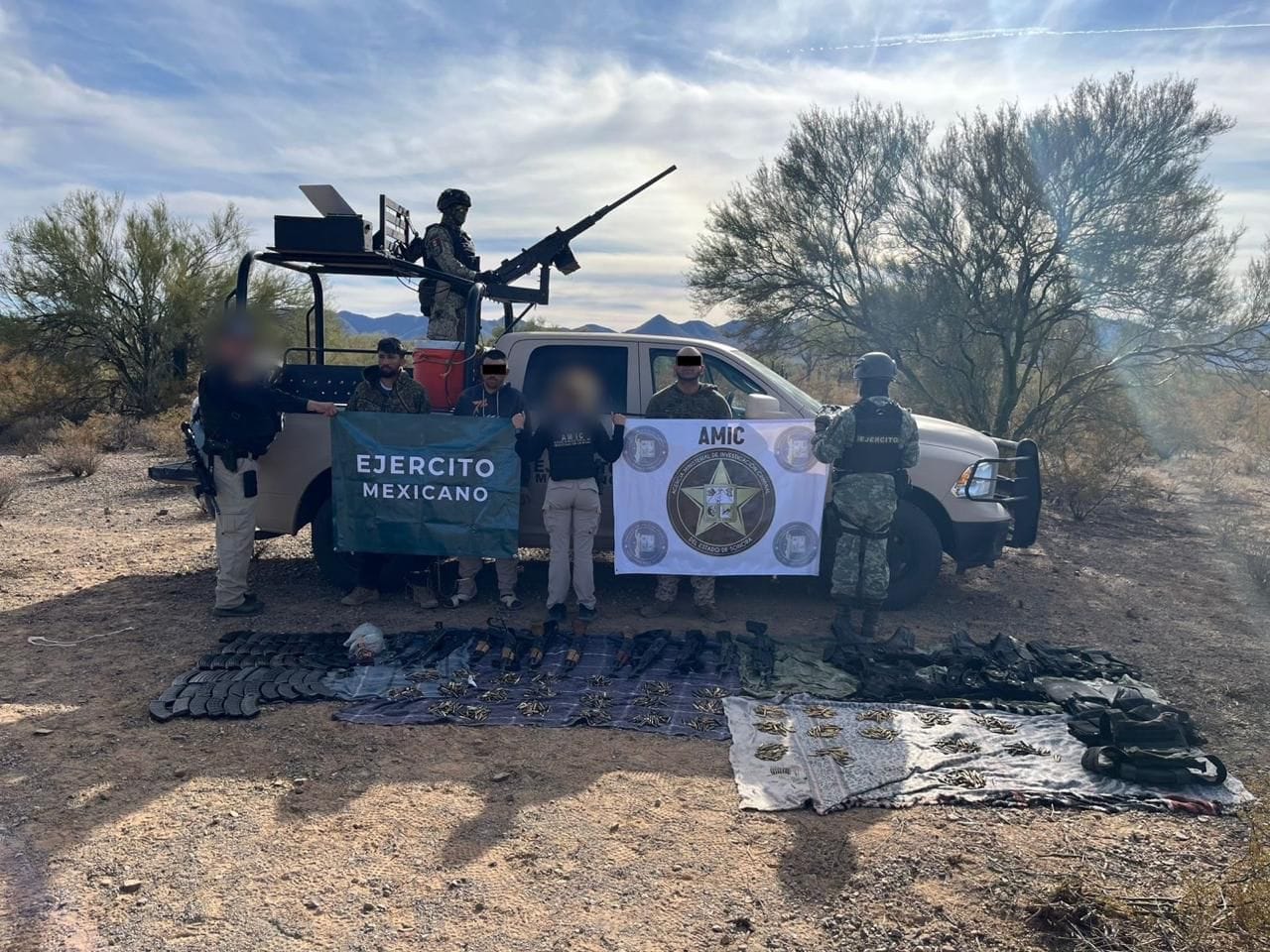 Hermosillo, Sonora; 11 de diciembre de 2024.- Autoridades que conforman la Mesa Estatal de Seguridad repelieron una agresión de civiles armados, logrando la detención de siete hombres en posesión de un arsenal de armas de fuego, vehículos y artefactos bélicos, en hechos ocurridos en el municipio de Caborca.