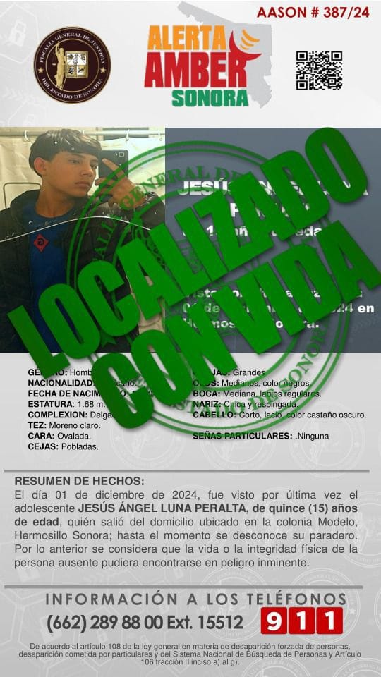 Hermosillo, Sonora, 13 de diciembre de 2024.- Elementos de la Agencia Ministerial de Investigación Criminal (AMIC), a través del Departamento Central de Personas Desaparecidas y/o Extraviadas, localizaron sano y salvo en Hermosillo a Jesús Ángel “N”, de 15 años, quien contaba con reporte de desaparición y activación de la Alerta Amber Sonora.