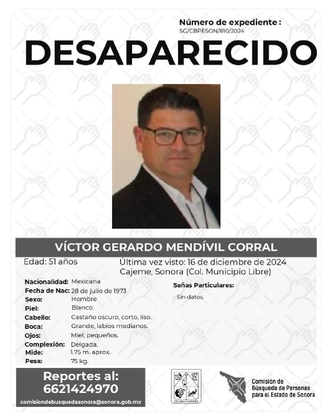 La Comisión de Búsqueda Para el Estado de Sonora solicita apoyo para localizar a VÍCTOR GERARDO MENDIVIL CORRAL.
