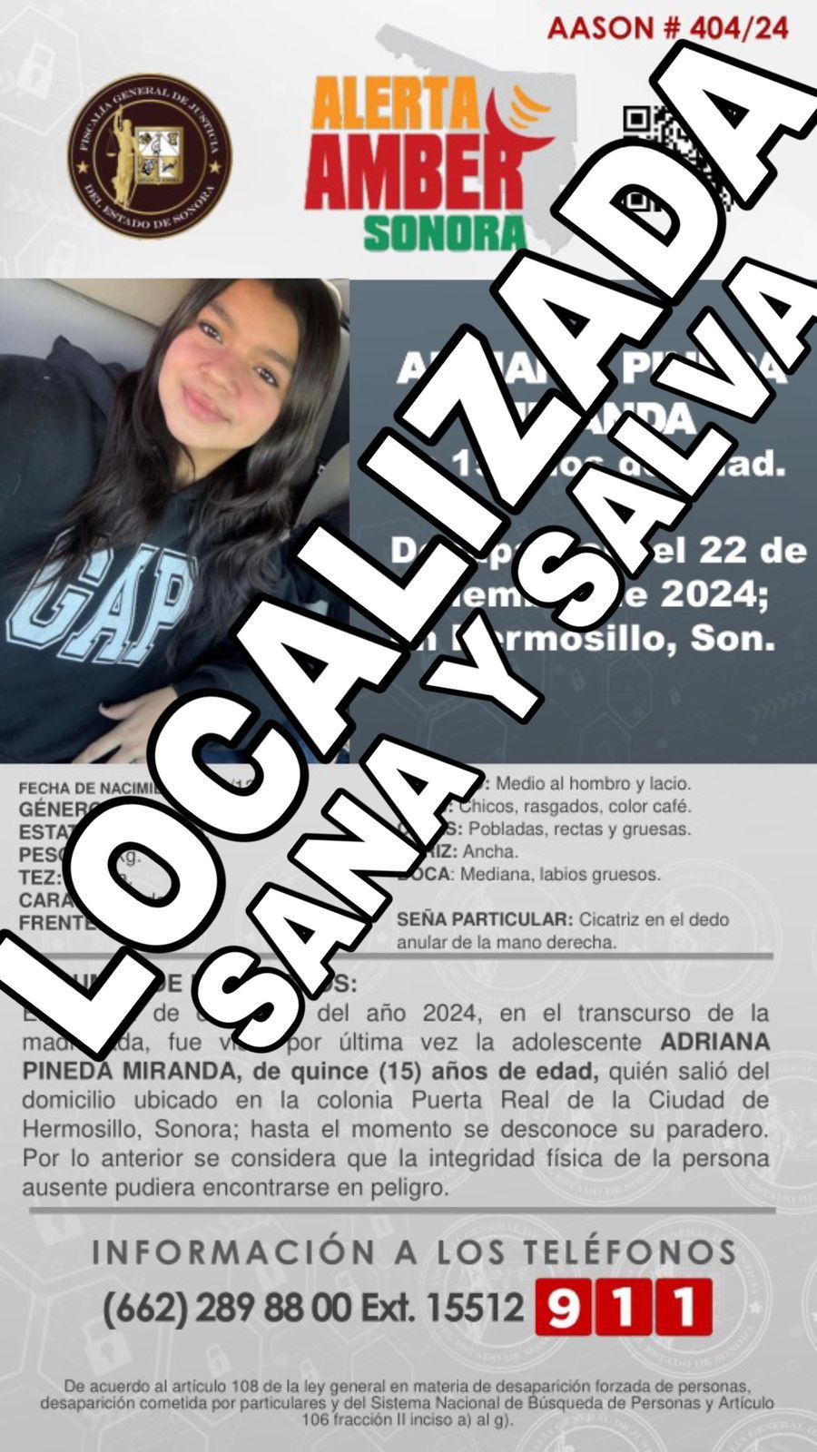 Huatabampo, Sonora, 23 de diciembre de 2024.- La Fiscalía General de Justicia del Estado de Sonora (FGJES), con personal de la Agencia Ministerial de Investigación Criminal (AMIC), localizó en Huatabampo, sana y salva, a Adriana “N”, de 15 años, quien contaba con una Alerta Amber Sonora emitida en Hermosillo el pasado 22 de diciembre.