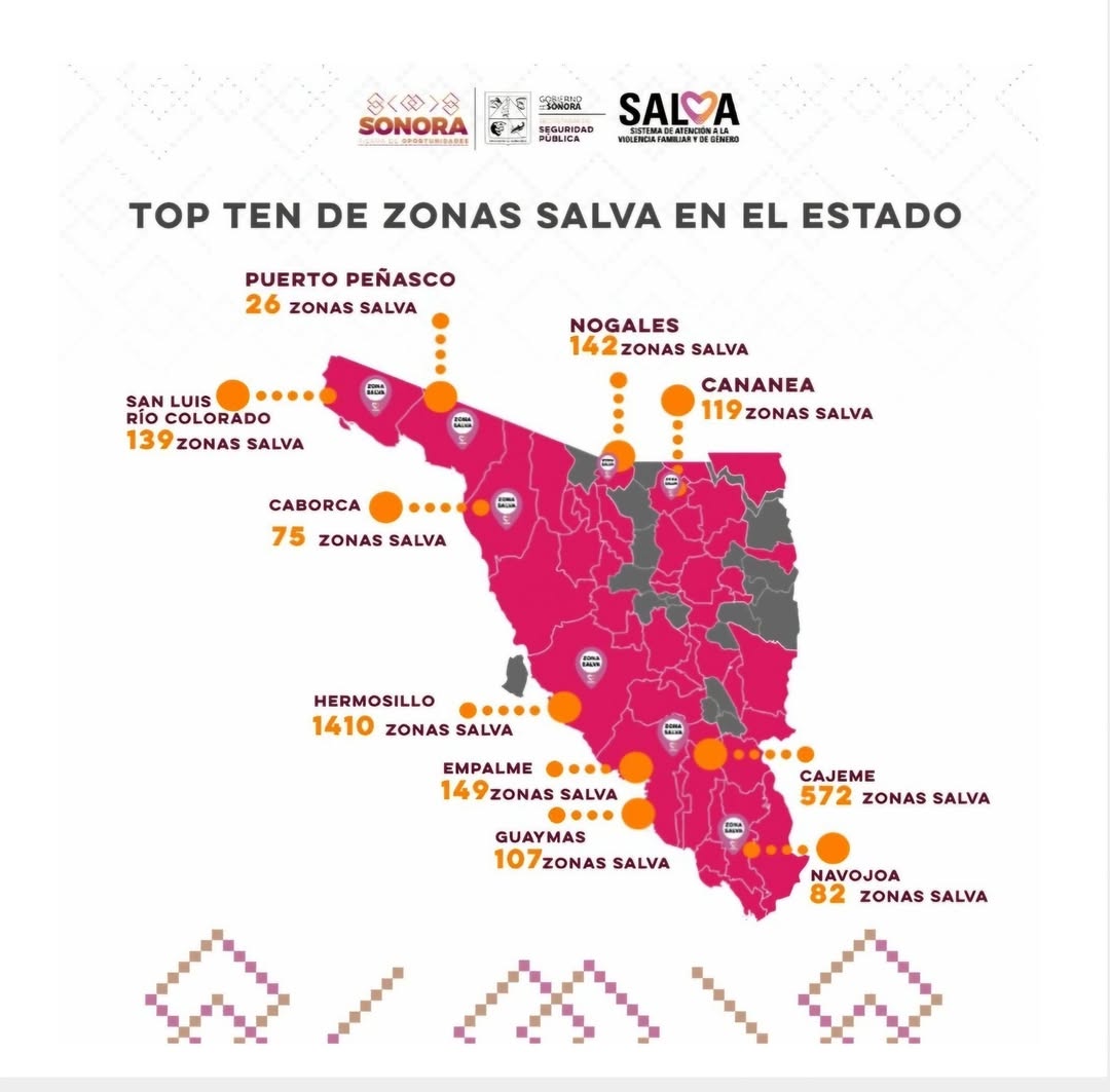 Encabezan la lista de los 10 municipios con mayor número de Zonas Salva en la entidad: Hermosillo con mil 410, Cajeme con 572, Empalme con 149, Nogales con 142, San Luis Río Colorado con 139, Cananea con 119, Guaymas con 107, Navojoa con 82, Caborca con 75 y Puerto Peñasco con 26.