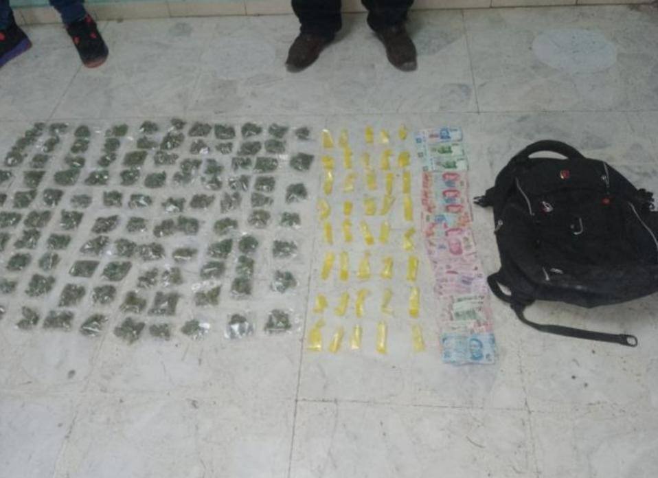 El primer recorrido fue en la colonia Campanario, por la calle San Isidro y Santa Inés de mencionado sector, sitio en el que agentes efectuaban patrullajes preventivos, asegurando a Joaquín Guadalupe “N.”, de 20 años y César Humberto “N.”, de 47 años, a quienes se les localizó en una mochila que portaban un total de 107 dosis de marihuana y 40 envoltorios de cristal.