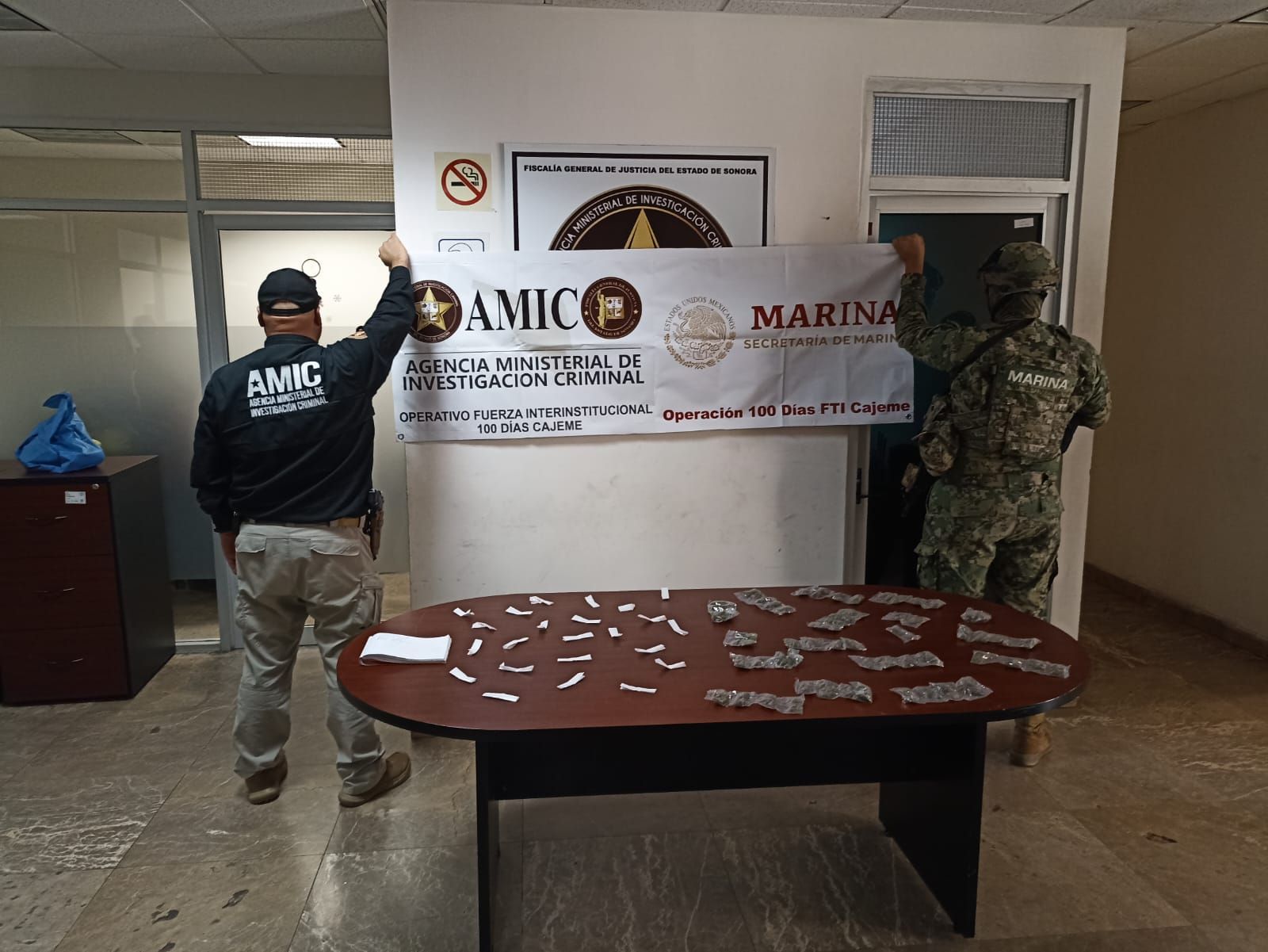 Durante la diligencia realizada en cumplimiento de la orden judicial correspondiente, participaron elementos de la Agencia Ministerial de Investigación Criminal (AMIC) y Secretaría de Marina Armada de México (SEMAR) quienes aseguraron 59 envoltorios con marihuana, 23 envoltorios con cristal, así como un cuaderno con apuntes que podría estar relacionado con actividades ilícitas.
