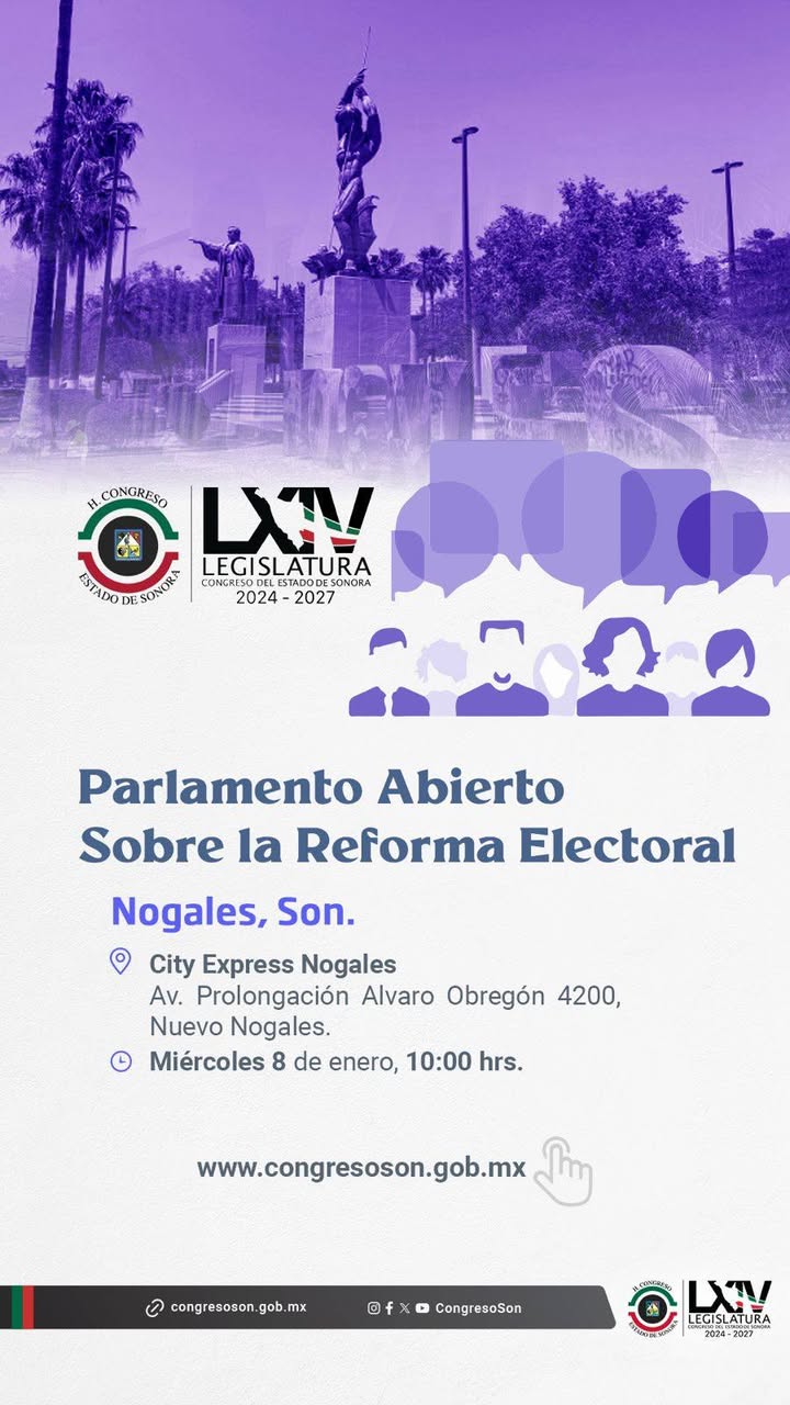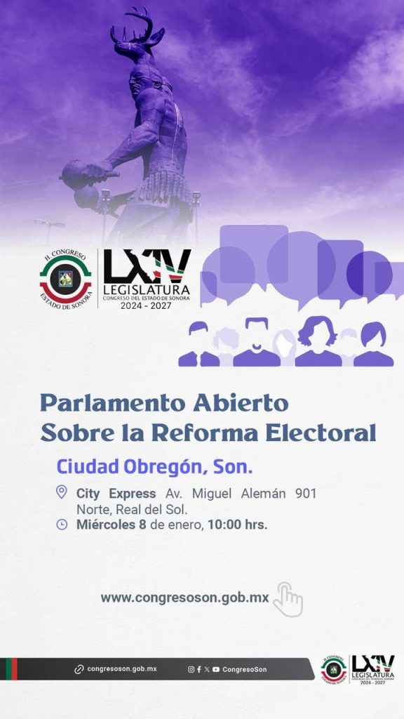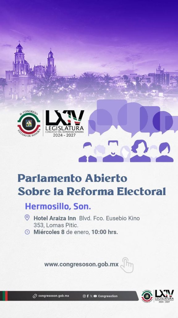 Hermosillo, Sonora; 6 de enero de 2025.- El Congreso del Estado de Sonora invita a la ciudadanía a participar en los Parlamentos Abiertos para socializar la iniciativa de reforma a la Ley de Instituciones y Procedimientos Electorales del Estado de Sonora, relacionada con la reforma al Poder Judicial local. Dichos foros se llevarán a cabo el próximo miércoles 8 de enero en Hermosillo, Cajeme y Nogales.