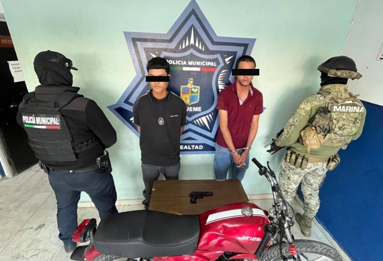 Por tal motivo, elementos de la Secretaría de Seguridad Pública Municipal (SSPM) y Marina, detuvieron a Juan Diego “N.”, de 22 años de edad, y a Jesús Alberto “N.”, de 19 años de edad, a quienes además se les aseguró una motocicleta Italika que contaba con reporte de robo, así como un arma de plástico color negro.