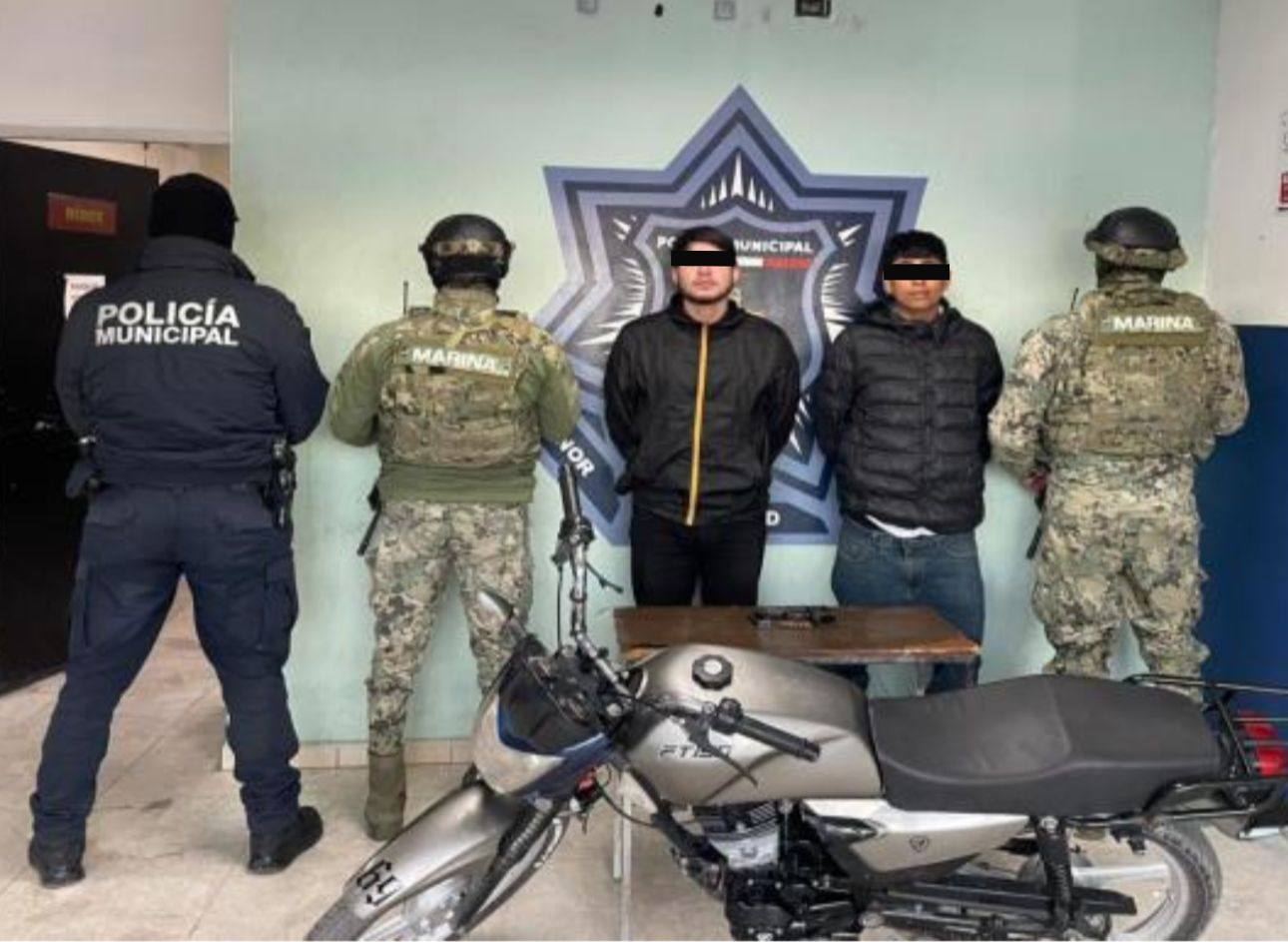 En otro hecho, en la colonia Los Arcos, personal de la SSPM y Marina lograron la detención de dos personas, tras observar que abordaban una motocicleta gris marca Italika sin placas de circulación. Los sujetos fueron identificados como Ángel Alexis “N.”, de 19 años, y Albert Abdiel “N.”, de 20 años, a quienes además se les encontró un arma tipo pistola con cargador abastecido, por lo que quedaron detenidos por la probable comisión del delito de violación a la Ley Federal de Armas de Fuego y Explosivos.