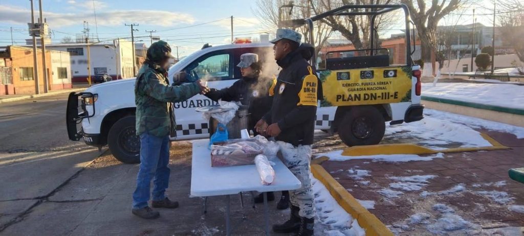 Personal de esta fuerza de seguridad pública también instaló un módulo de distribución de bebidas calientes, en la colonia Aerojuarez, municipio de Juárez, Chihuahua.