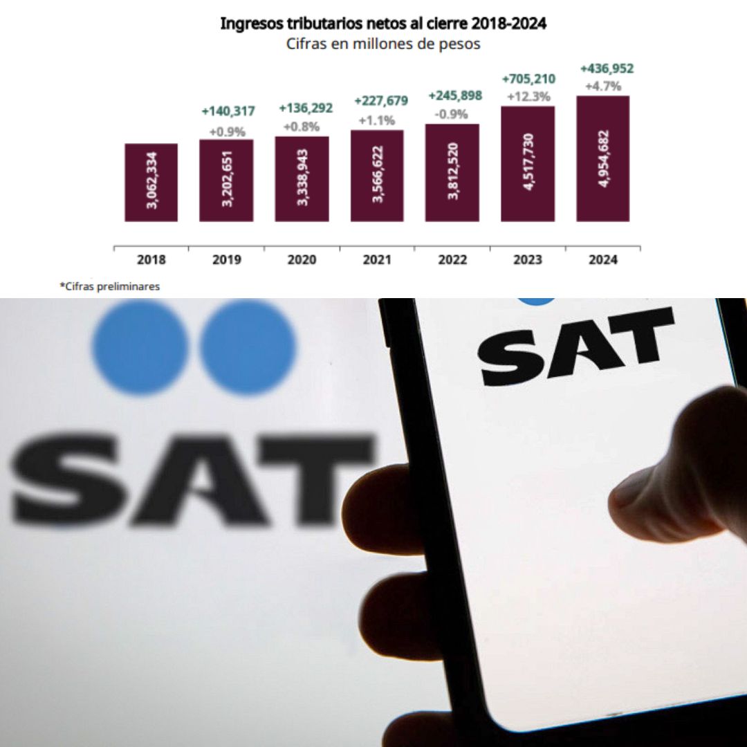 El Servicio de Administración Tributaria (SAT) informa que la recaudación tributaria alcanzó 4 billones 954 mil 682 millones de pesos en el ejercicio de 2024, lo que representa un incremento de 436 mil 952 millones de pesos en comparación con 2023, es decir, un crecimiento real de 4.7 por ciento.
