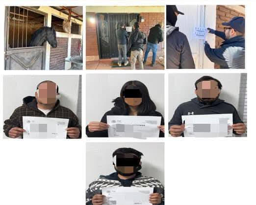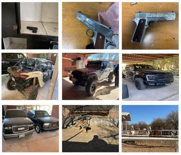 En esta diligencia se aseguraron también un tigre, dos venados y 19 caballos, así como seis vehículos y 298 mil pesos en moneda nacional.