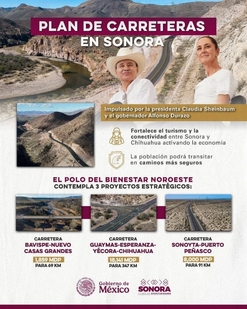 -La construcción de la carreta fue una gestión del gobernador Alfonso Durazo, la cual respaldó la presidenta Claudia Sheinbaum para iniciar y construir este 2025, con una extensión de 69 kilómetros que beneficiará la conectividad en la zona serrana del estado.