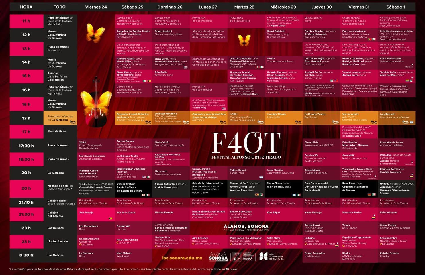 Prepárate para disfrutar de la edición 40 del Festival Internacional Alfonso Ortiz Tirado, del 24 de enero al 1 de febrero de 2025, con artistas de talla internacional como Ana Torroja, Edith Márquez, Monsieur Periné, Jay de la Cueva, Kika Édgar y muchos más.