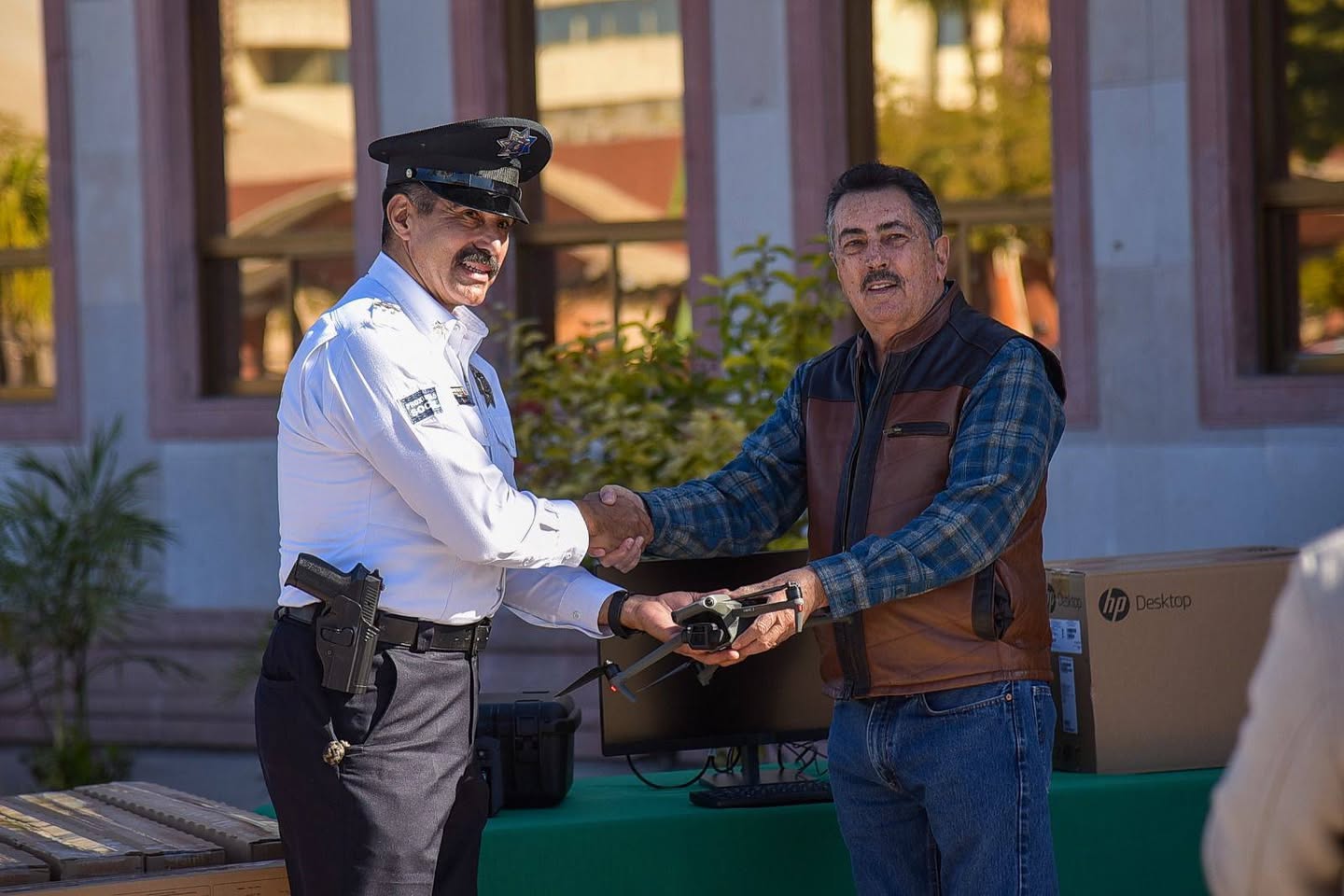 Además de 1 Dron Matrice 3TD, que es capaz de operar durante 50 minutos y cuenta con un sistema de monitoreo ambiental, que incluye sensores para detectar lluvia, velocidad del viento y temperatura, está equipado con una cámara infrarroja y tiene un alcance operativo de hasta 10 km; así como dos drones DJI Mavic3 Enterprise que son compactos, portátiles y cuentan con una cámara de 20 MP y zoom híbrido de 56x. Tienen un tiempo máximo de vuelo de 45 minutos y evaden obstáculos de manera omnidireccional. Su rango de control alcanza los 15 km. Asimismo se entregaron 20 equipos de cómputo HP y 36 pantallas de TV LED de 50 pulgadas.