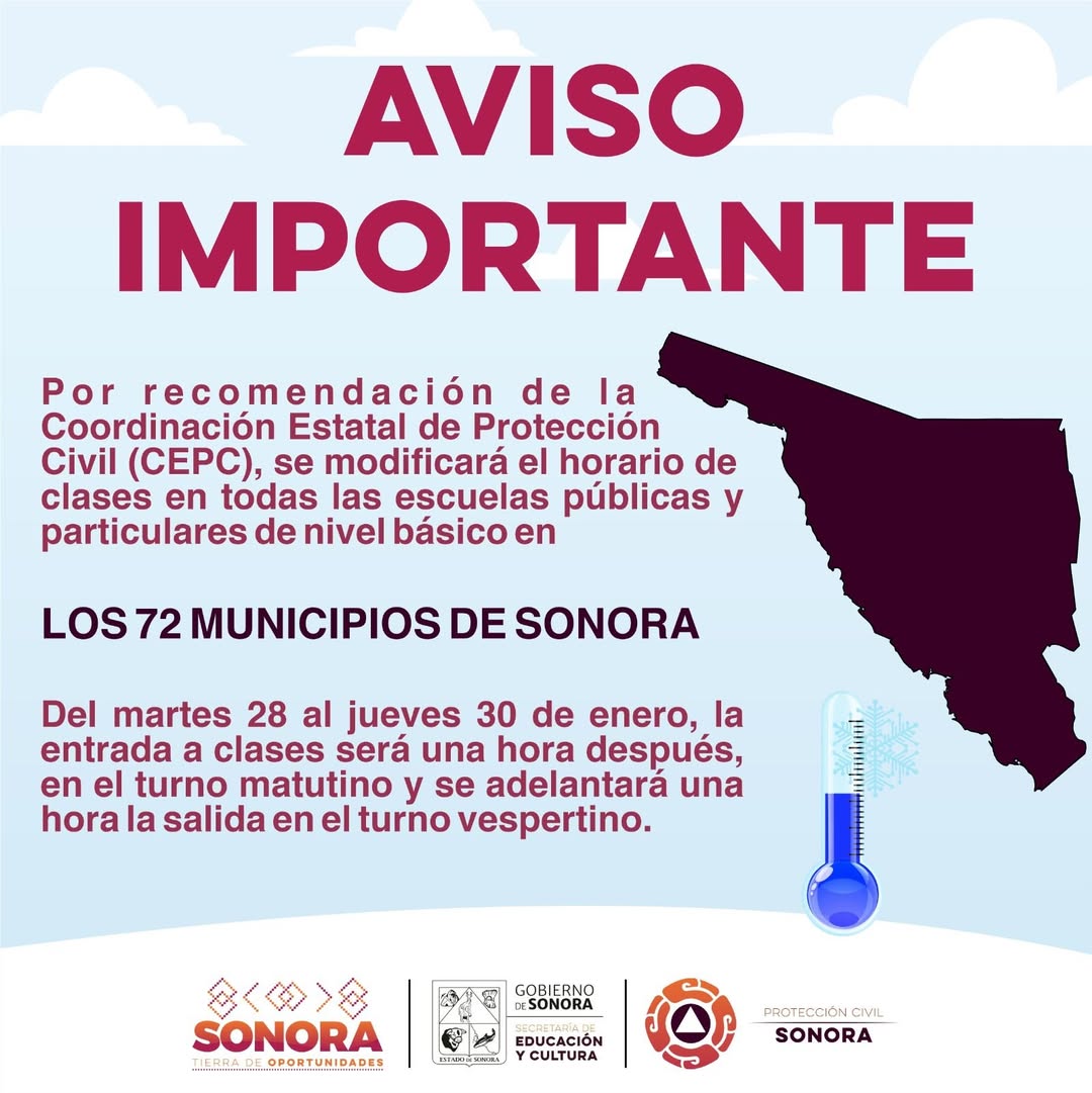 Hermosillo, Sonora; 27 de enero de 2025.- Ante los pronósticos de bajas temperaturas, la Coordinación Estatal de Protección Civil (CEPC) recomendó a la Secretaría de Educación y Cultura (SEC) la modificación del horario de clases en los 72 municipios sonorenses del martes 28 al jueves 30 de enero, anunció Froylán Gámez Gamboa.