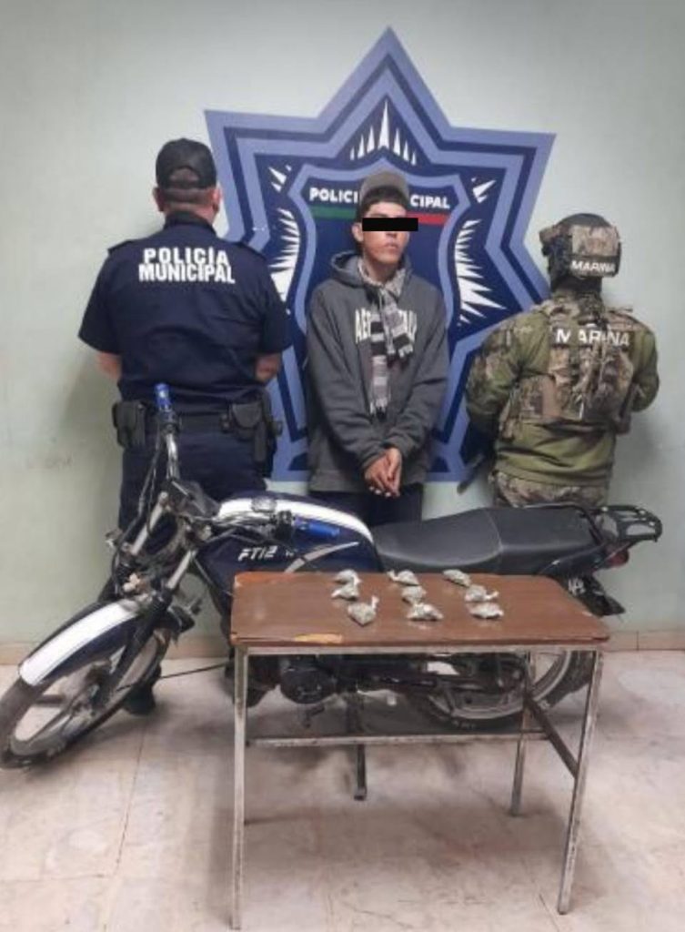 En otro hecho, durante un operativo coordinado en las calles Niños Héroes y Guerrero, policías municipales detectaron una motocicleta azul sin placas de circulación. Tras iniciar una persecución, lograron detener al conductor en la intersección de las calles Calzada Valdez Herrera y California. Al sujeto, identificado como Luis Arturo “N.”, de 20 años, se le encontró una bolsa gris con 9 envoltorios que contenían hierba verde con características similares a la marihuana.